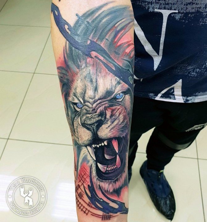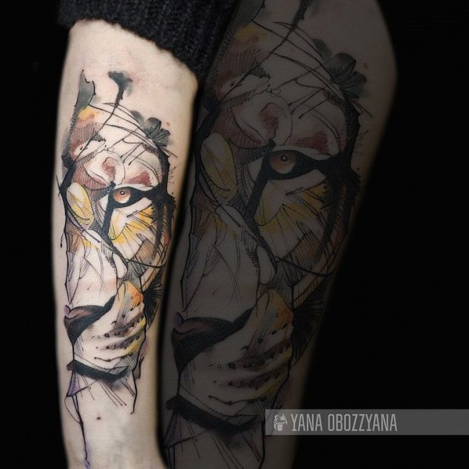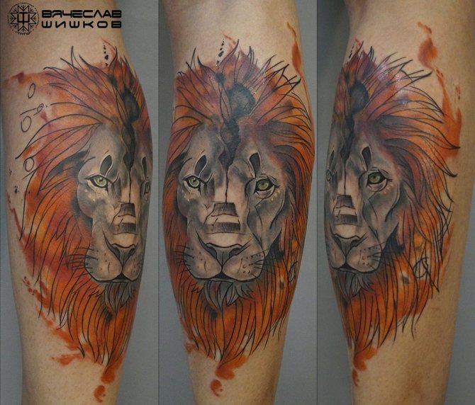 - Akvarel - velmi krásný, pozitivní a laskavý styl, který používá několik jasných barev najednou, což dodává kresbě na působivosti. Tetování lva ve stylu akvarelu si často vybírají dívky.