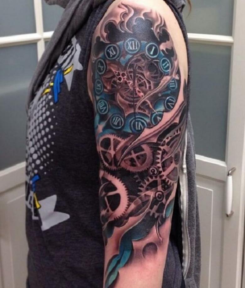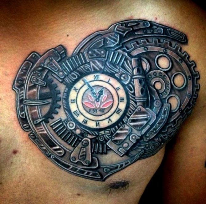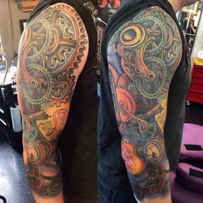 Steampunková tetování, která pokrývají celou ruku nebo záda, jsou obvykle navržena s biomechanickými motivy: jako by pod kůží byly mechanické části, ciferníky, trubky, převody. Často se jedná o imitaci absence kůže nebo záměrně hrubé řezy a trhliny.