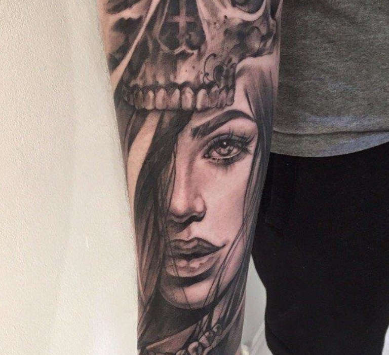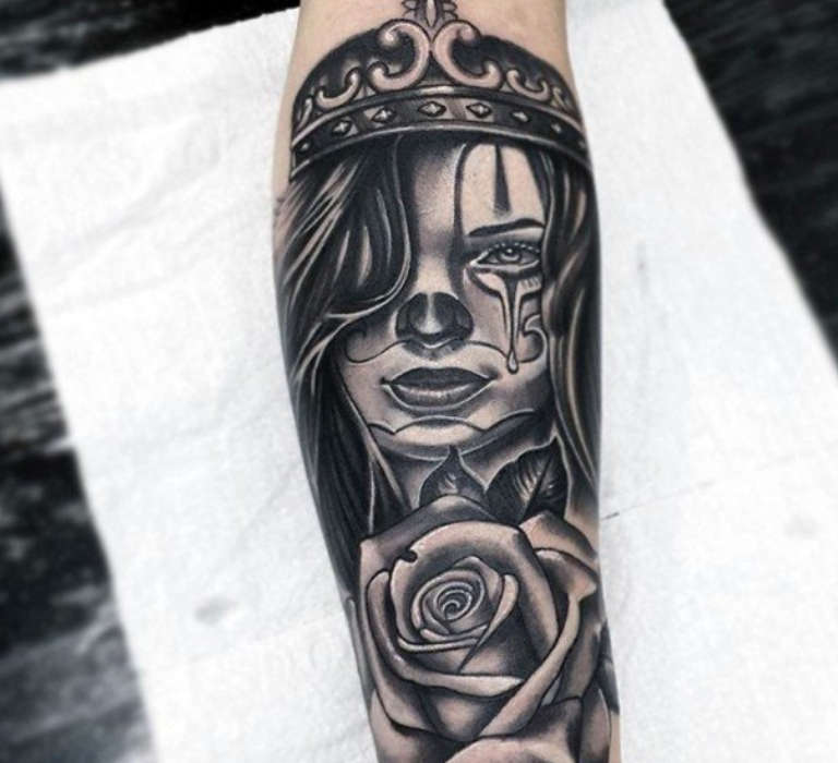 Oblíbený tetovací portrét s lebkou se zabývá filozofickým vnímáním smrti. Nositel se nebojí jít za hranu, ale k přechodu přistupuje s respektem. Tetování ženy s korunkou je vhodné pro ty, kteří si váží života a usilují o úspěch.