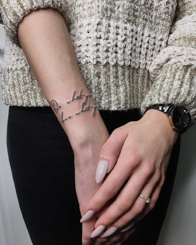 Existuje ještě jeden stereotyp: říká se, že textová tetování jsou výhradně pro dívky. Ale to není tento případ! Lze předpokládat, že tento názor vznikl kvůli takovému rysu tetování, jakým je doslovnost. Posuďte sami: obraz, zejména symbolický, lze interpretovat různými způsoby. Některé obrazy jsou velmi dvojsmyslné, a tak se lidé zdobí kresbami lebek, hodin, démonů, ptáků a šípů.