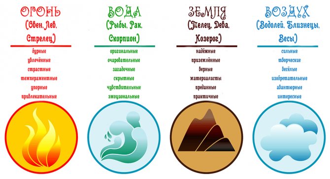 Každý z výše uvedených prvků ovlivňuje svou vlastní skupinu symbolů a dává lidem narozeným v té či oné konstelaci odpovídající povahové rysy.