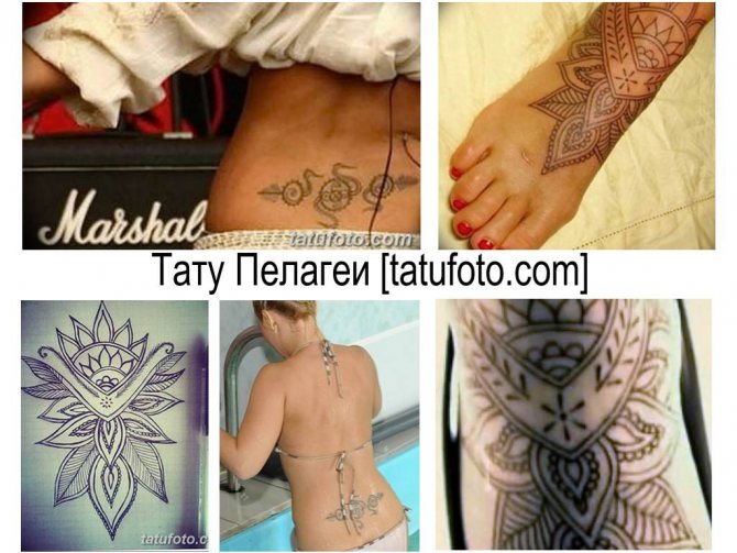 - Fotografie tetování na noze Pelageya ukazuje, jak krásný a neobvyklý může být vzor na těle. Zřetelně se na něm objevují indické lidové motivy. Pelageyino tetování na noze bylo jejím dlouholetým snem, který se objevil hned poté, co se objevilo to první. Zpěvačka si opravdu přála obraz ve stylu indických svatebních vzorů. Folková zpěvačka říká, že sezení trvalo šest hodin a na konci pro ni bylo těžké. Zpěvaččina matka se obávala, že Pelageyino tetování bude agresivní a provokativní, ale nakonec dceřinu volbu schválila.