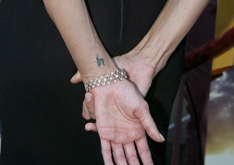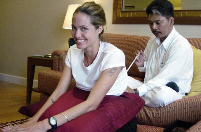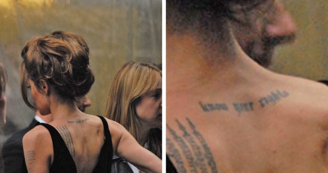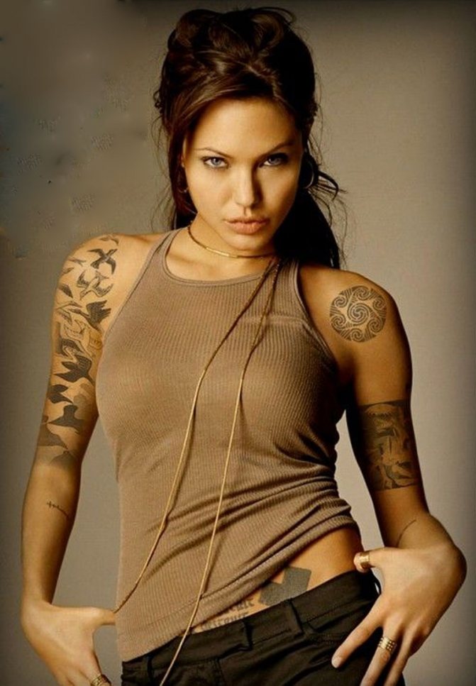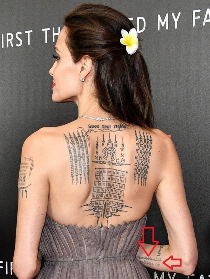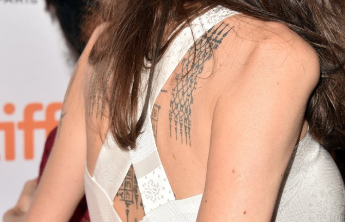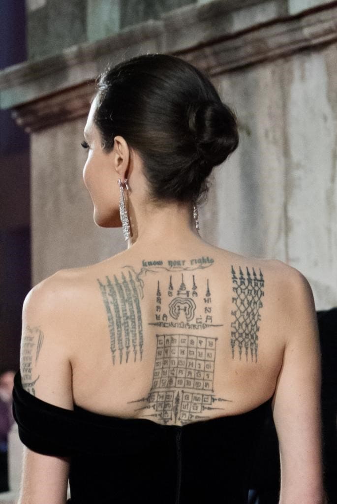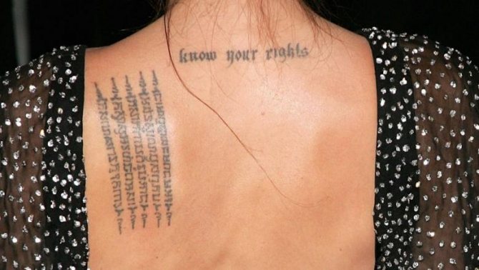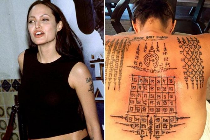 Jako mladá herečka si Angelina Jolie nechala na lopatku vytetovat japonský znak znamenající "smrt", protože trpěla depresemi. O mnoho let později se tato hvězda stala poprvé matkou, když adoptovala kambodžského chlapečka. Tento zážitek radikálně změnil její pohled na svět a postavu překryla buddhistickou modlitbou v sanskrtu. Nové tetování na lopatce Jolie znamená přání bohatství a krásy a slibuje přátelskou podporu a ochranu před nepřáteli.