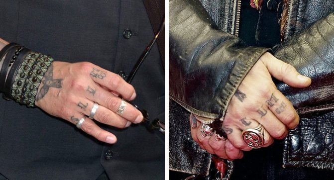 Johnny Depp si také nechal na prsty napsat Slim. Je to přezdívka herečky Amber Heardové. Po těžkém rozchodu si ho opravil na Scum, což znamená "šmejd".