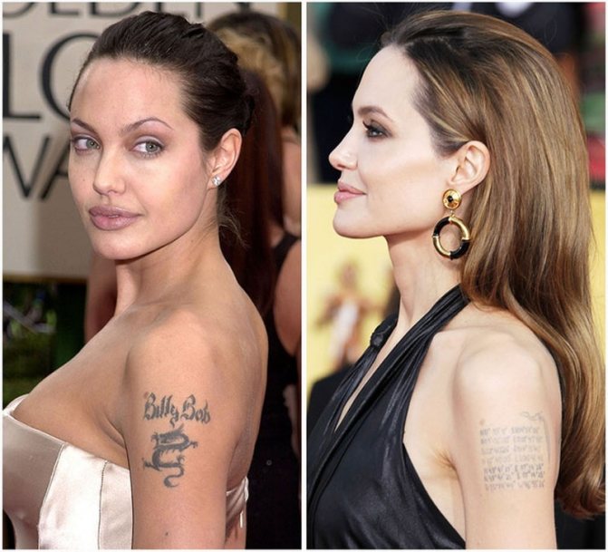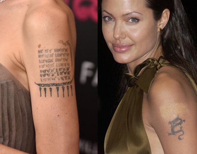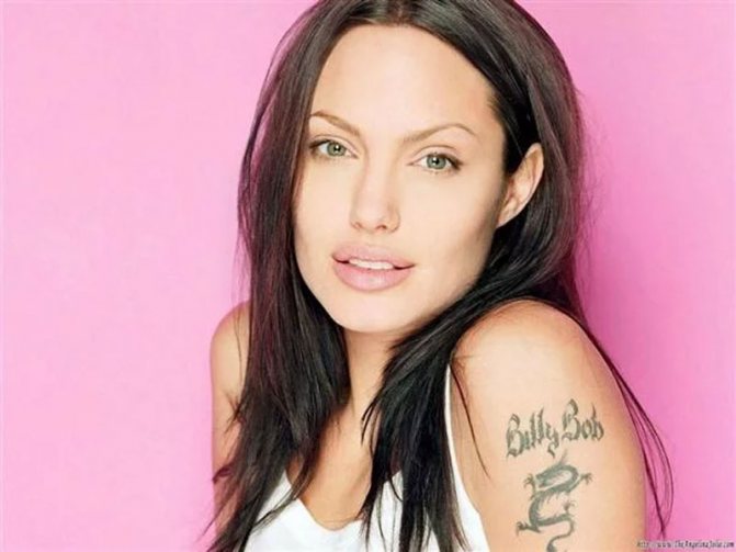 Dříve měla Angelina Jolie na levém rameni tetování v podobě čínského draka a nápisu "Billy Bob". Ten byl natočen na počest Billyho Boba Thorntona, za kterého byla herečka provdána. Když milostný příběh skončil, zbavila se nejprve jména, pak - i draka.