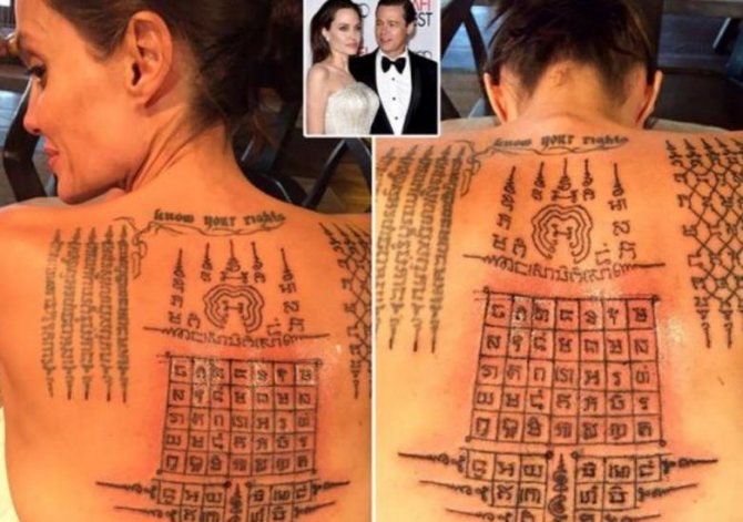Význam tetování Angeliny Jolie na zádech je plný hlubokého významu. Starobylá buddhistická znamení měla znamenat manželské štěstí a znovu oživit jejich duchovní pouto. Bohužel jim to nepomohlo zůstat manželským párem. Nejkrásnější a nejharmoničtější.