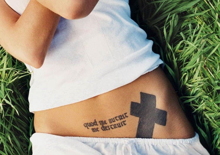 Dalším překrývajícím se tetováním je kříž. Stalo se tak těsně před její svatbou - tehdy si herečka vzala svého prvního manžela Jonnyho Lee Millera. Kalhoty s nízkým pasem byly v módě, takže na všech fotografiích Angeliny Jolie si fanoušci okamžitě všimli nového tetování a začali spekulovat o jeho významu. Ve skutečnosti na něm kdysi byl drak, ale podle herečky se nechala tetovat bez rozmyslu a chtěla se ho už dávno zbavit.