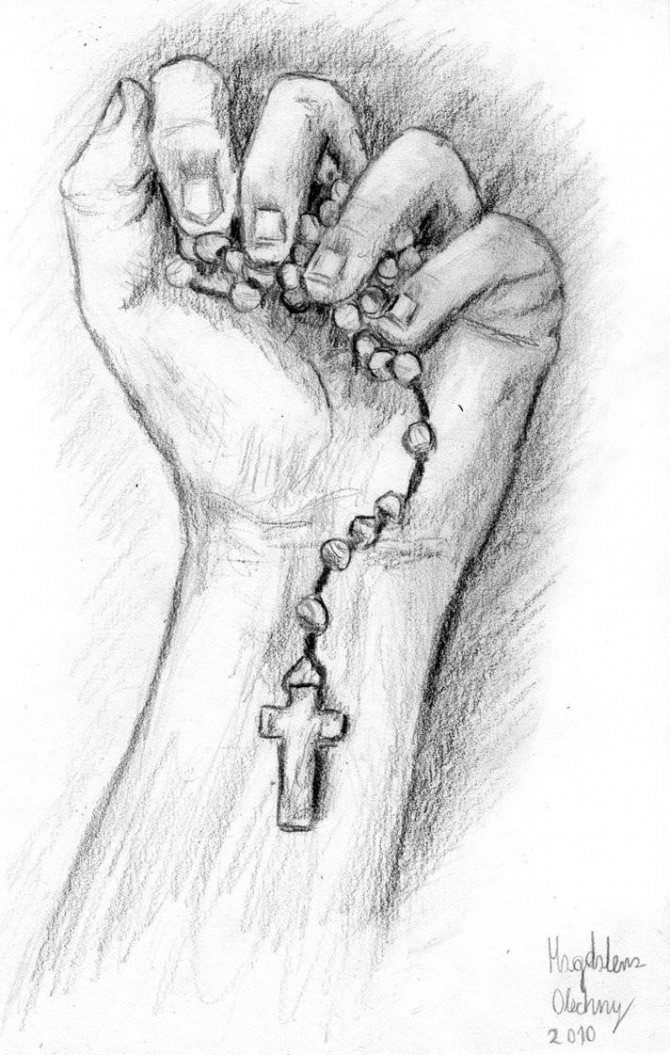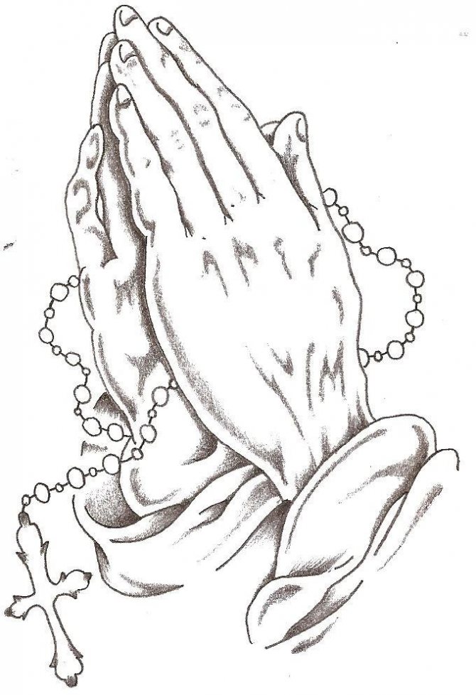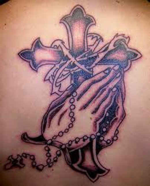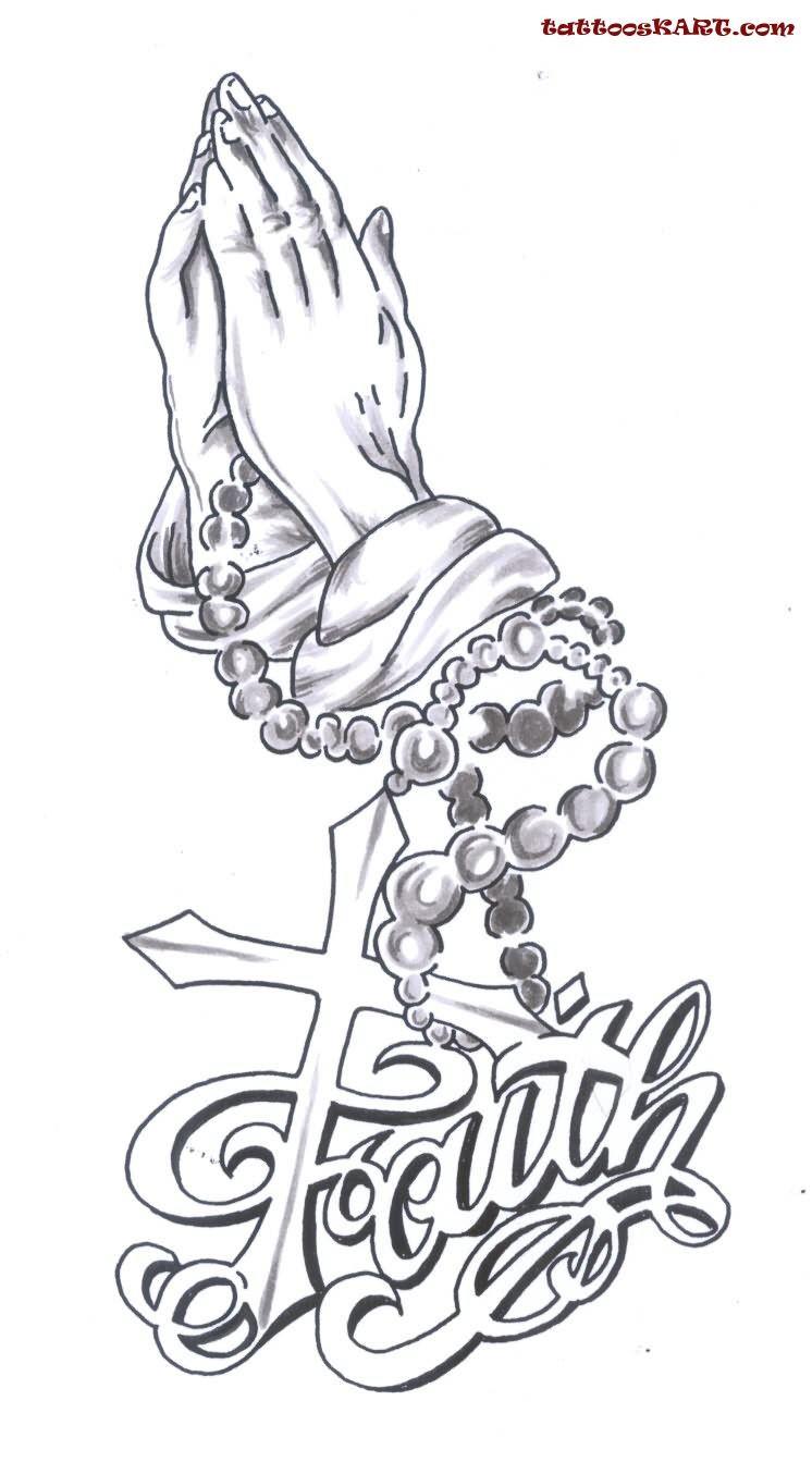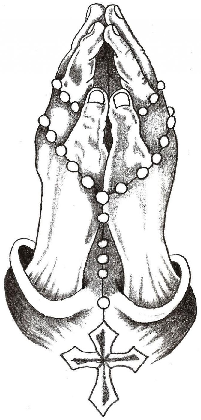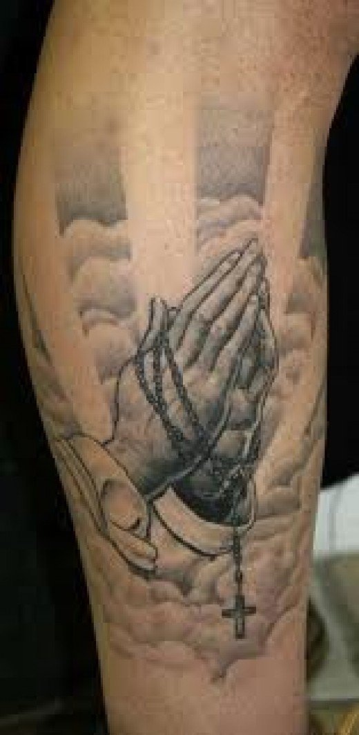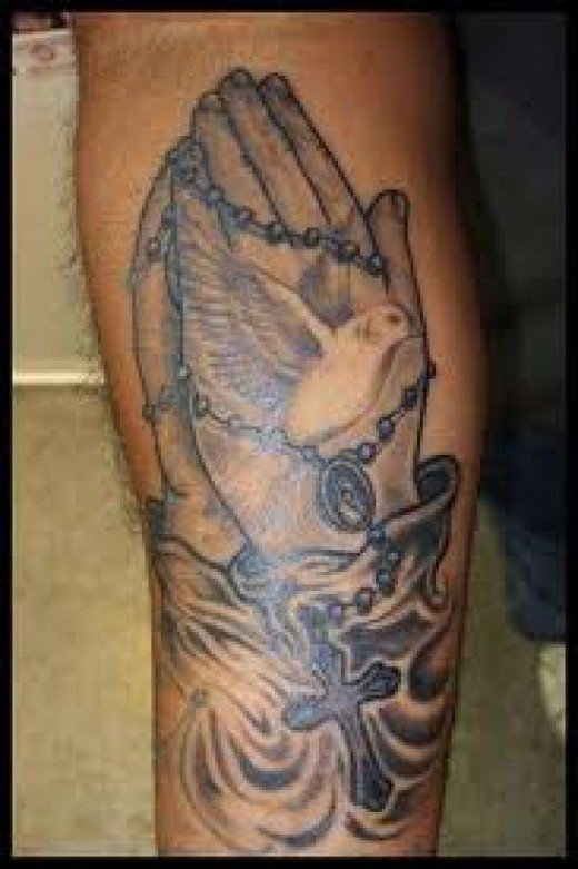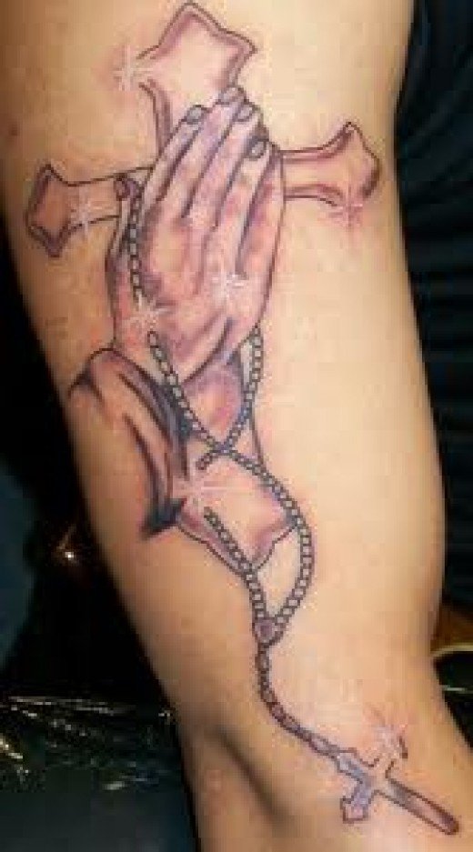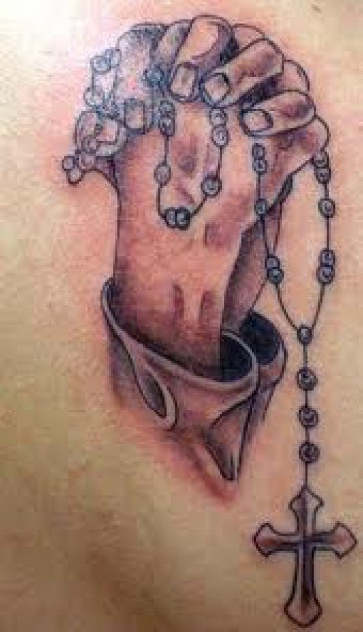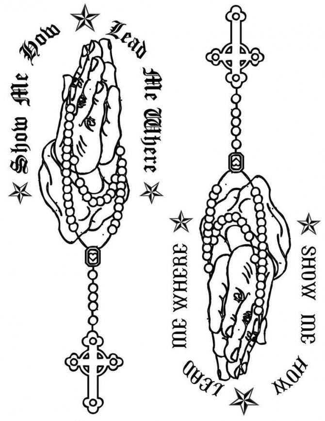 Jeden z nejběžnějších vzorů charakteristické modlitební ruky drží růženec, který je obvykle omotán kolem ruky nebo padá mezi prsty. Toto tetování může symbolizovat vaši víru a lásku k náboženství. Návrh se používá také jako památník a r. i. P tat věnování těm, které jsme ztratili.