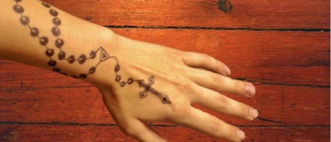 V závislosti na typu tetování se interpretace designu liší. Dříve se kříž tloukl na prsa, což posilovalo ochranu před negativními vlivy a zlými duchy. V moderní společnosti může mít takový znak na ruce volný význam a volný výklad nositele. Pokud je pravoslavný symbol obklopen růžencem, je to znamení hluboké víry a poznání sebe sama.