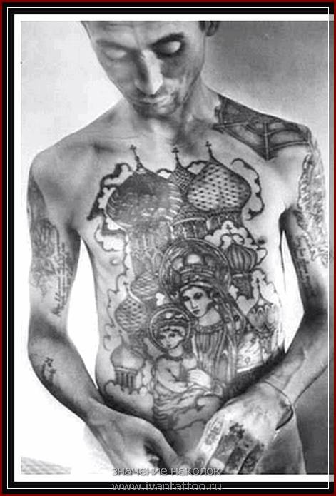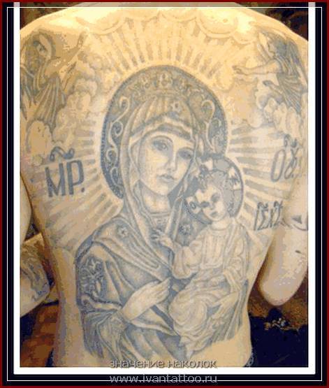 Tetování "Matka Boží" je znakem mladého vězně, který byl zlodějem. Někdy znamená talisman, proti nějakému neštěstí, neštěstí, smůle.