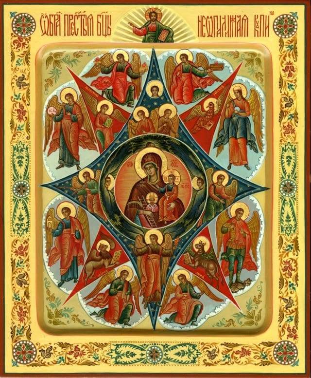 Posvátný obraz Neopalimaya Kupina je orámován oktogramem překrytým na sebe a otočeným o 45 stupňů, který se týká dalších čtverců.