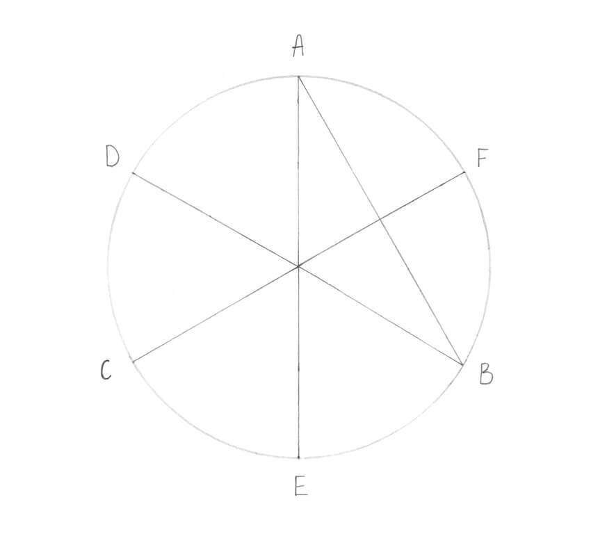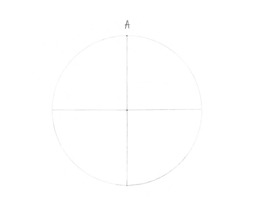 Nakreslete dvě přímky (svislou a vodorovnou), které se protínají ve středu kružnice. Označte horní bod svislého kruhu písmenem A.