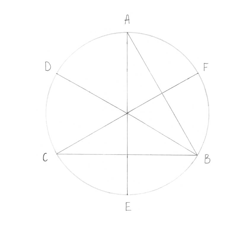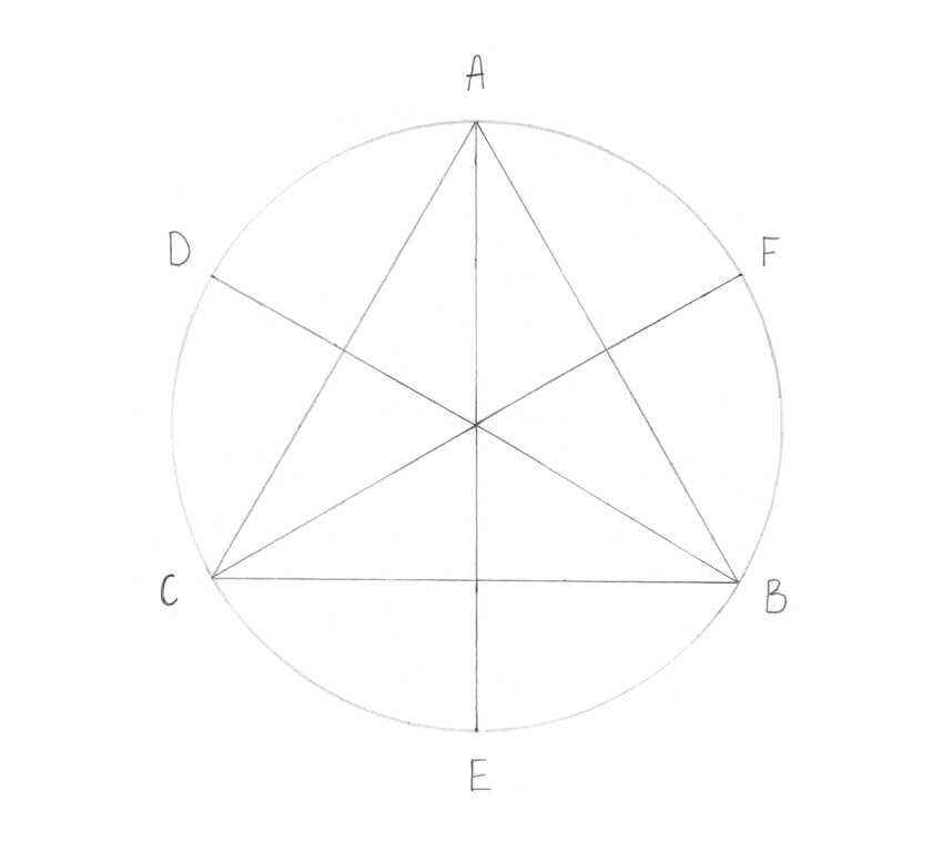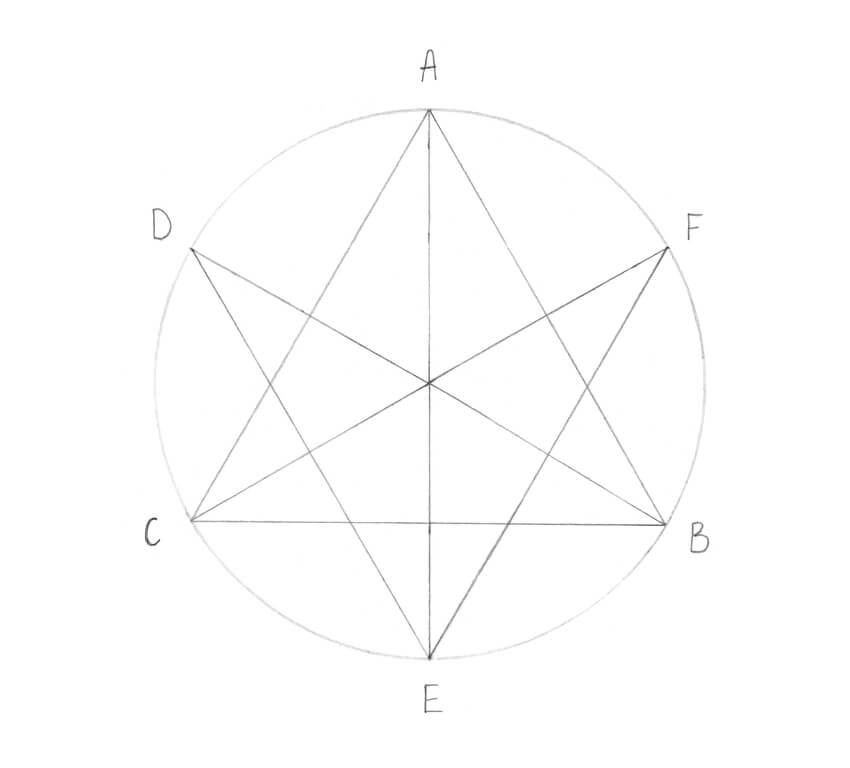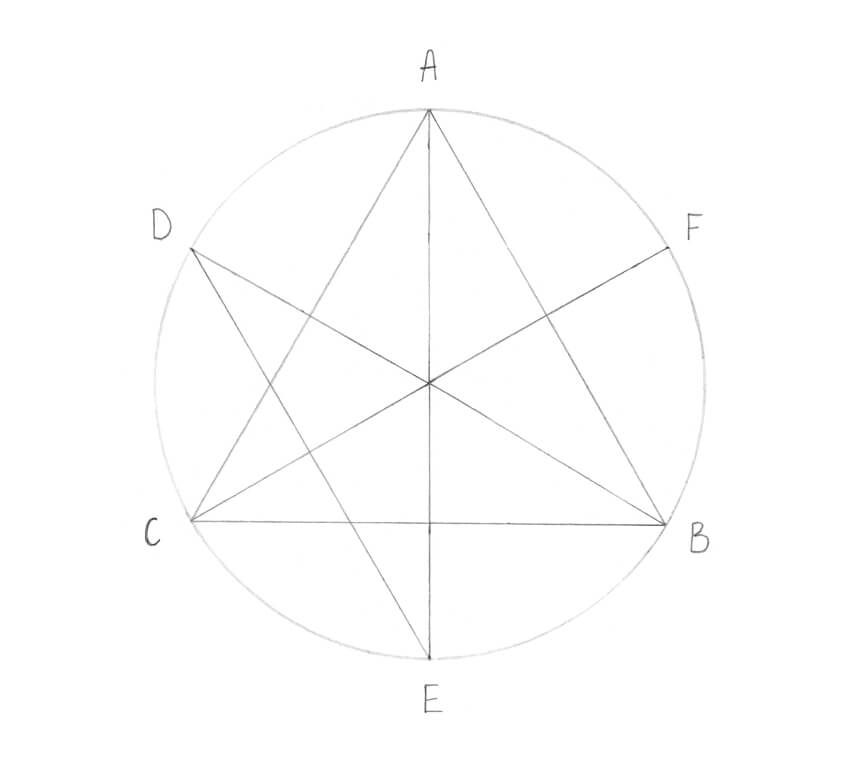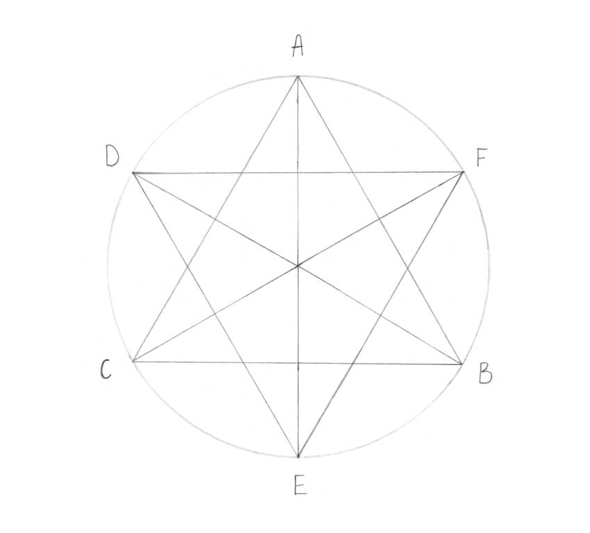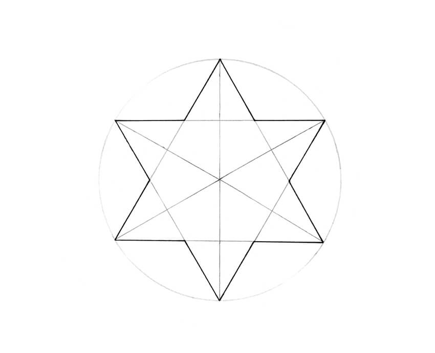 Spojte body D a F a získejte převrácený trojúhelník. Základna šesticípé hvězdy je připravena.