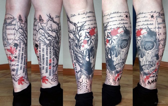 Visse områder af dit ben kan være forsynet med en ordforbindelse - eller en sætning, afhængigt af antallet af tegn. Ofte suppleres indskriften med et mønster, et design eller enkelte elementer. Blandt tatoveringsfans kan nævnes favoritterne: "Han (hun) går i tro", "Jeg finder vejen eller baner den selv", "Den hellige vej", "Vær modig, gå derhen, hvor du har det godt", "Han (hun) tror på sin styrke", "Vejen vil føre den, der går".
