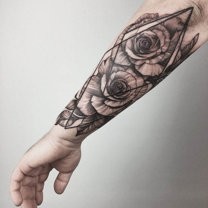- Designets geometriske karakter. Selv om Dotwork-stilen nu også bruges til at skabe klassiske gammeldags billeder, bruges den stadig primært til at skabe strenge geometriske former. De bruges til at flette indviklede armbånd om håndleddene, kraver om halsen osv. Geometriske mønstre kan sammenlignes med blonder;