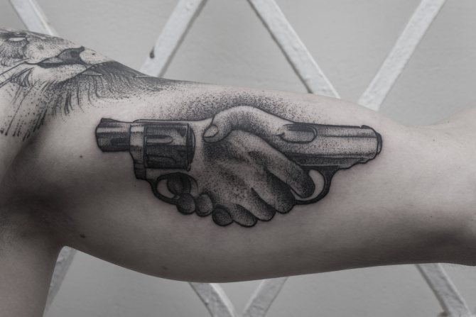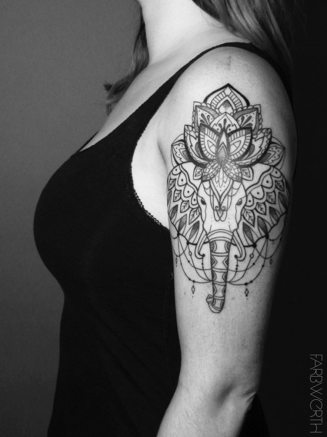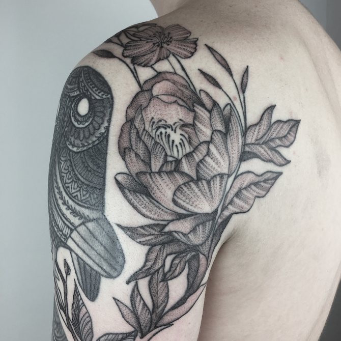Tatovering i stil med Dotwork - En særlig retning i kropsmaling. Den har rødder på det afrikanske kontinent, hvor man for nogle få tusinde år siden fandt hulemønstre af mennesker, hvis kroppe viste punktmønstre. Selve ordet består af to dele - punkt og arbejde. Det første betyder fra det engelske sprog "dot", det andet betyder "arbejde". Heraf fremgår det vigtigste træk ved denne tatoveringsstil. Alt arbejde udføres ved hjælp af dot-teknikken, som i sidste ende bliver til en fuldgyldig tatovering.