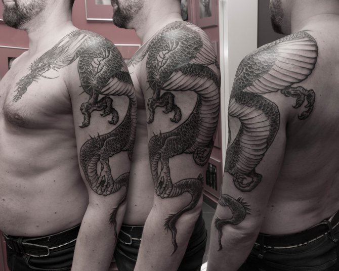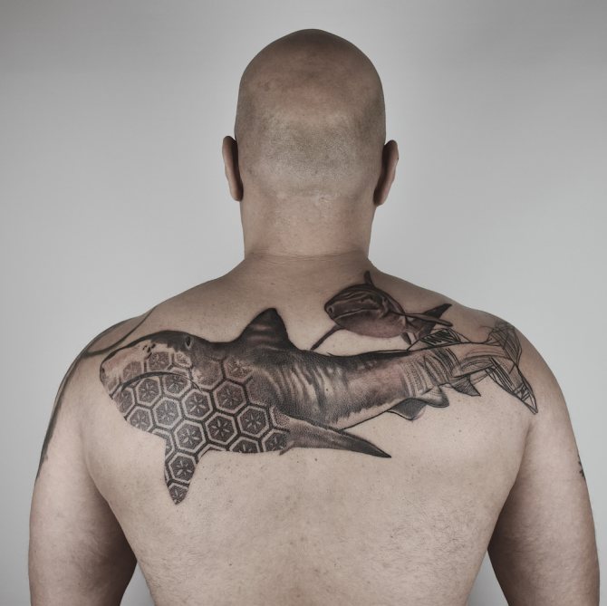 En mandlig tatovering i denne teknik er primært voluminøs og storskala. Dotwork er et godt valg til et ærme eller en helt slået ryg, da denne teknik som ingen anden formidler dybden af et stort ornament.