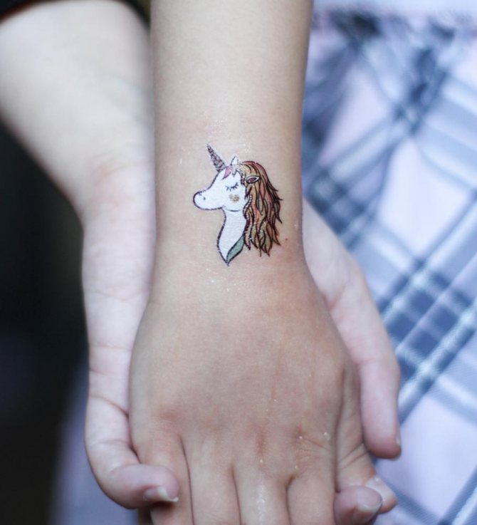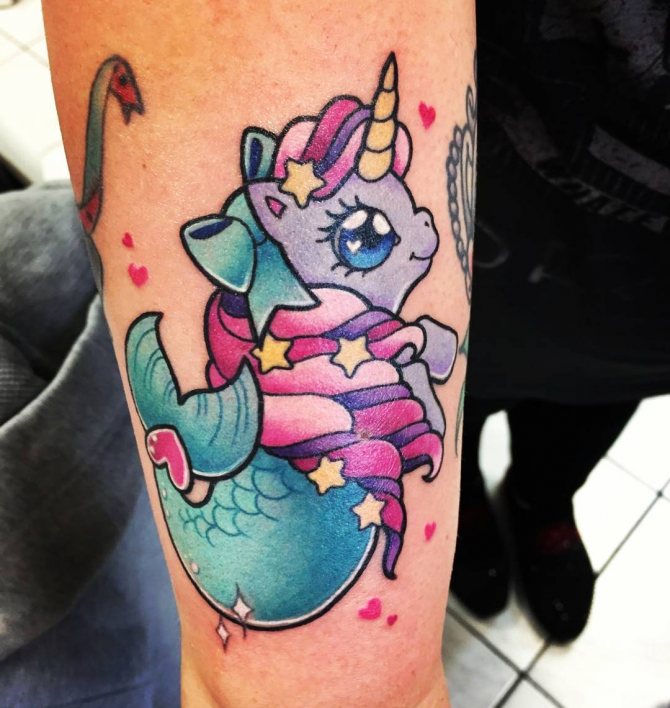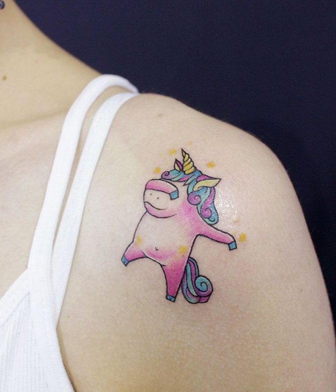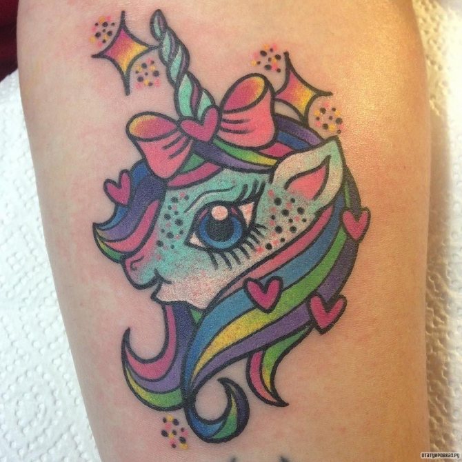 Den mest populære er naturligvis realismen. Takket være ham har billedet fået det mest naturlige udseende med en karakteristisk detalje i form af et horn i panden. I dette tilfælde er der imidlertid tale om fantasidetaljer. Det kan være havskum, skyer, vinger, roser og meget mere. Det afhænger alt sammen af personlige præferencer og kunstnerens kreative vision. Det er ikke ualmindeligt for piger at vælge en tatovering i form af en tegneseriefigur.