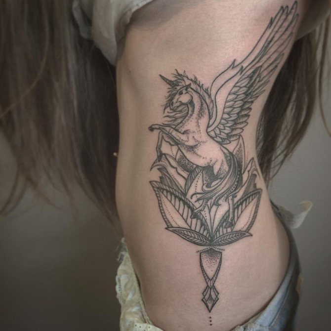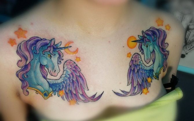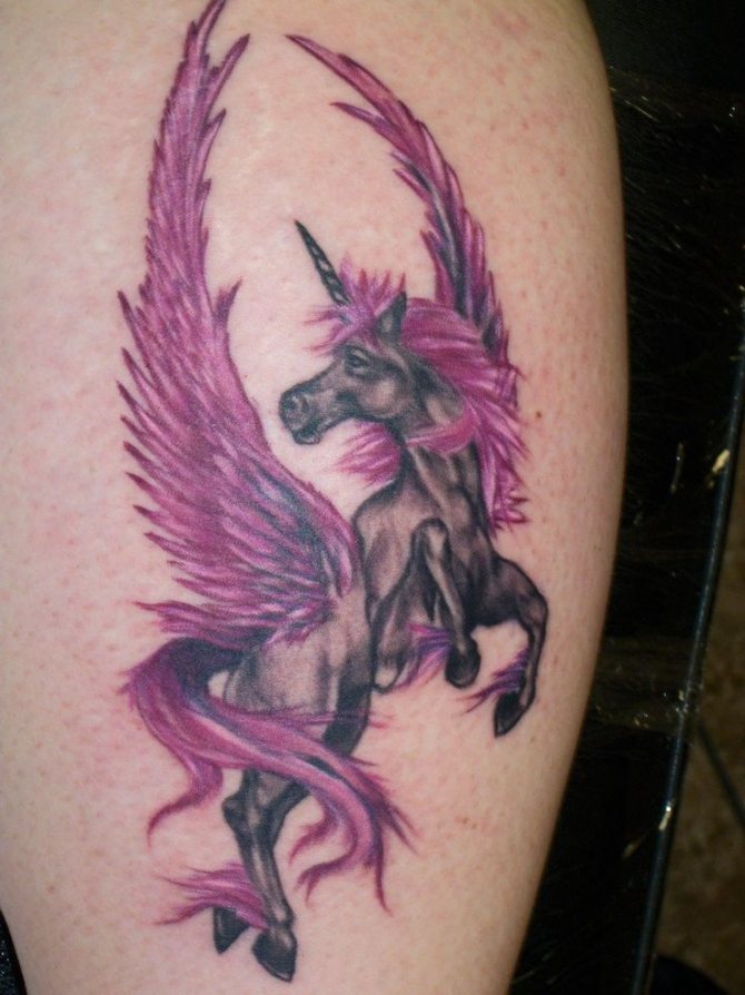Det skal nævnes, at vingerne ofte er tilføjet til enhjørningen. På denne måde forenes enhjørningen med Pegasus, hvilket straks ændrer tatoveringens betydning. Designet symboliserer tiltrækning, men også styrke.