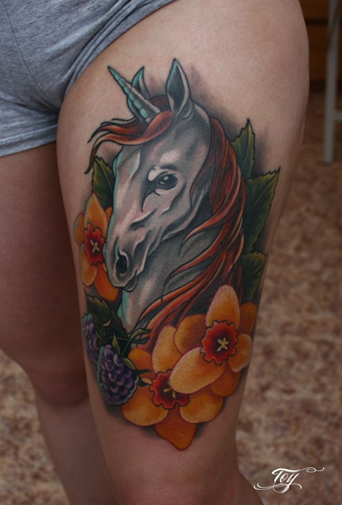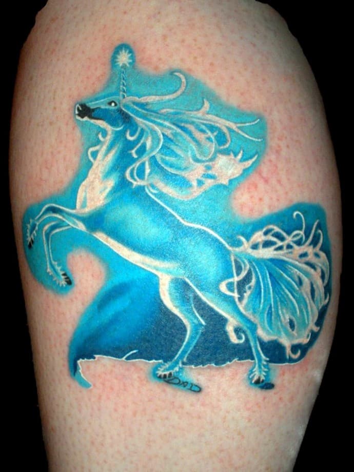 En række mytiske væsner, herunder enhjørninger, er blandt de mest populære billeder til tatoveringer. Den mest almindelige er en tegning af en hvid hest med et horn i panden og med blå øjne.