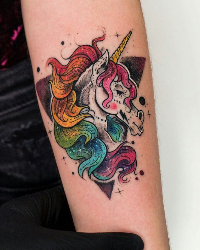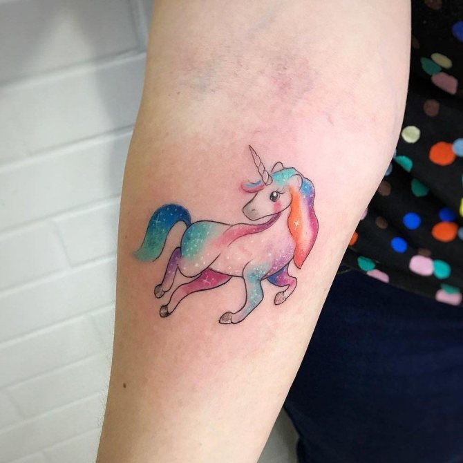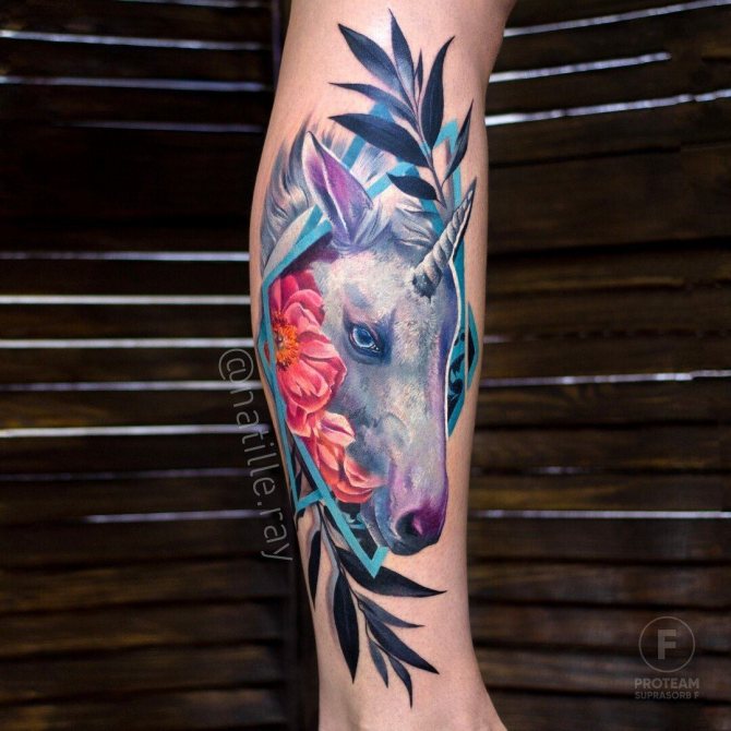 Og selvfølgelig er det umuligt ikke at nævne akvarel-tatoveringsstilen. I dette tilfælde bliver enhjørningen altid særlig smuk på grund af de farvede accenter og detaljer i billedet.