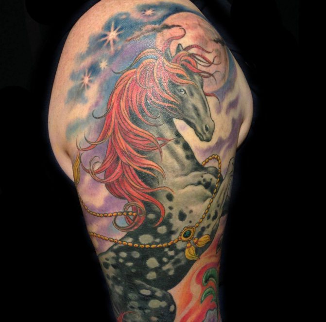 Det er ikke ualmindeligt, at billedet af en enhjørning bliver valgt til mænd. Og den er ikke kun velegnet til romantiske naturer, men også til mere strenge og brutale medlemmer af det stærke køn. I dette tilfælde er værdien af enhjørningen magt og storhed. Desuden betragtes en sådan tatovering som en kraftfuld amulet. Dette fremgår af gamle legender, ifølge hvilke heste med vinger hjælper alle, der er i knibe.