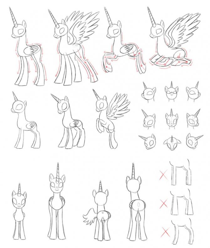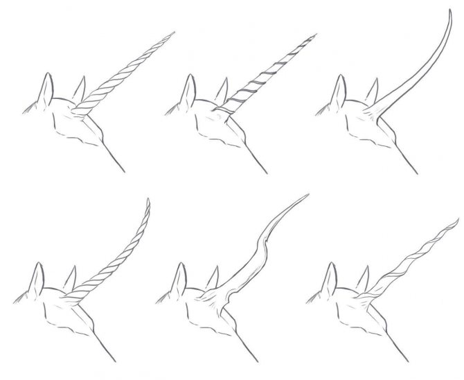Her finder du tegninger af en liggende, siddende, stående, sovende, sovende og flyvende enhjørning. Og også skemaer til tegning af dele: horn, vinger.