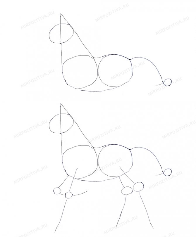 Øret er toppen af trekanten, og lige under det markerer hovedet. Tegn buede linjer til ryggen og maven, og marker halen på højre side. Lav en linje af ben, marker med små cirkler, hvor du folder.