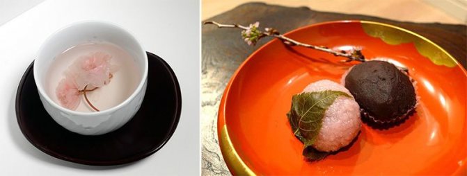 Sakuraiyu, en drik lavet af sakura-blomster (til venstre) Lyserøde sakuramochi riskager lavet af klisterris og botamochi lavet af en blanding af klisterris og almindelig ris (til højre)