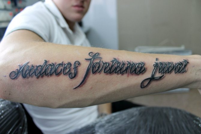 Indskriften kan være afbildet på alle mulige interessante måder og skrifttyper, f.eks. i en buet form, i form af et mønster eller et ornament. Men det vigtigste kriterium, som en mand bør udpege for sig selv, er temaet for indskriften. Det kan være en tatovering om kærlighed, venskab, familie, Gud og forskellige filosofiske ordsprog.