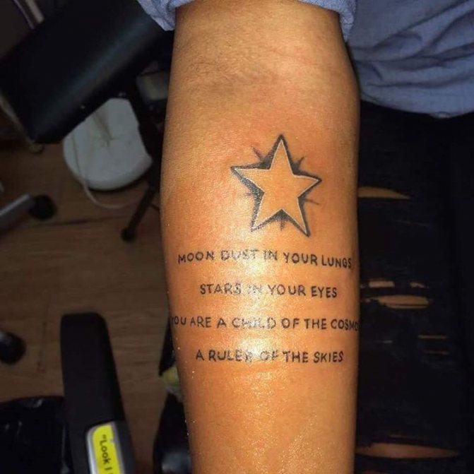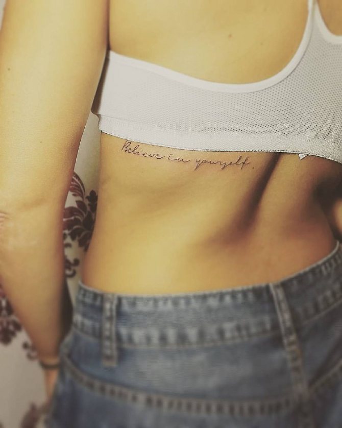 Tatoveringer i form af inskriptioner er populære, fordi en tegning ikke altid kan formidle en persons overvældende følelser og udtrykke den inderste mening. Latinske sætninger fra berømte vismænd om filosofiske emner inspirerer til handling og får dig til at tænke over livet. Den valgte sætning skal være i harmoni med den indre og ydre verden hos den person, der har valgt den. Du kan f.eks. anvende en indskrift i salonen med smuk skrift "Med mig min skytsengel" på latin. Tatoveringen er lavet med sort blæk, og du bør undgå kontakt med fugt og kosmetik, så sætningen ikke mister sin klarhed og farve.