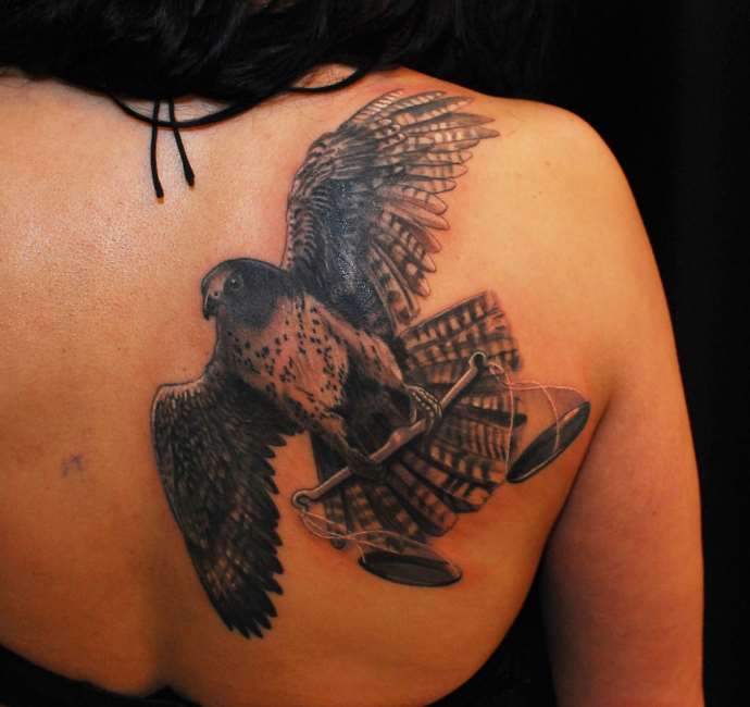 Tatovering af en falke på en piges skulder, realisme