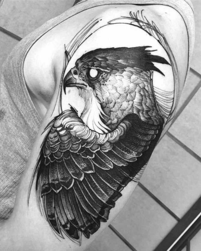 Du kan vælge en skitse med et hoved, der er omhyggeligt eftertegnet, eller et billede, der viser et medlem af falkonerfamilien i jagtøjeblikket. Der findes mange varianter af færdige skitser. Du skal vælge den rigtige størrelse, sammensætning og betydning af billedet, idet du tager hensyn til kønnet på den person, der scorer en tatovering.