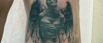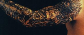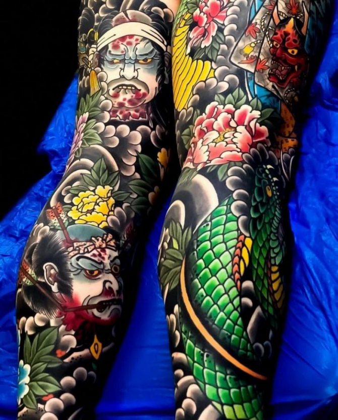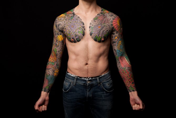 Ved hjælp af en særlig fyldeteknik kan du opnå en høj lysstyrke i kanterne på baggrund af en afdæmpet tone i den centrale del. Prisen for japanske tatoveringer er ret høj, da mesteren arbejder på tatoveringen i mere end en dag.