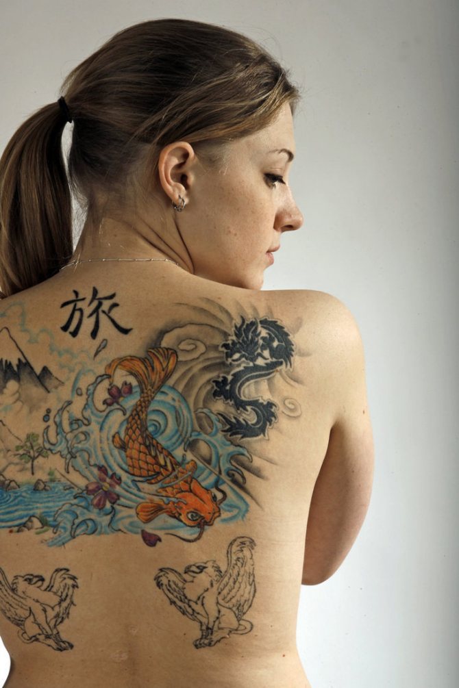 Bagsiden er et passende sted til de største skitser. Her er det muligt at udstoppe flere slags dyr, blomster og træer, en tegning af en samurai eller en maske. Denne tatoveringsmulighed overrasker altid med sin størrelse og lysstyrke.