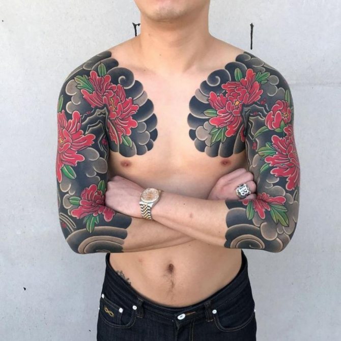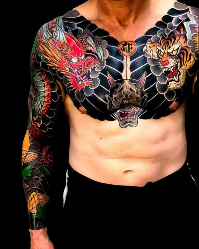 Tatoveringer på brystet er af beskyttende karakter. På brystet er der et drage- eller tigermønster med blomstermønstre.