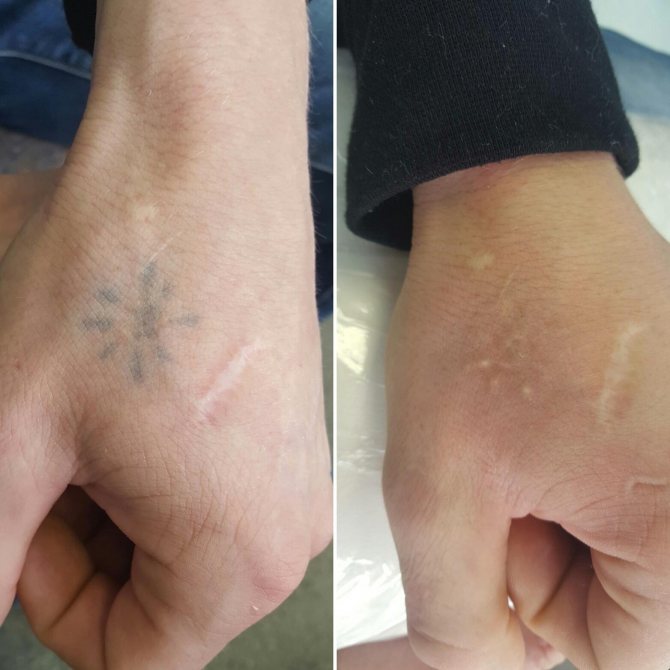 - Koagulation (der anvendes strøm med forskellig frekvens). Efter indgrebet er tatoveringen stadig et tyndt og glat hudområde uden ar, men arret er stadig tilbage. Huden er ikke solbrændt;