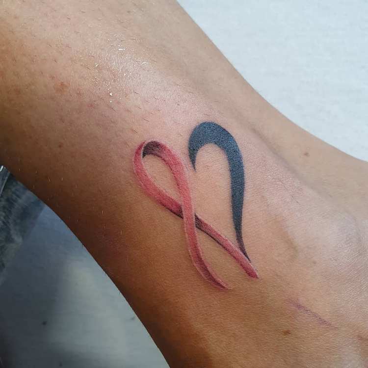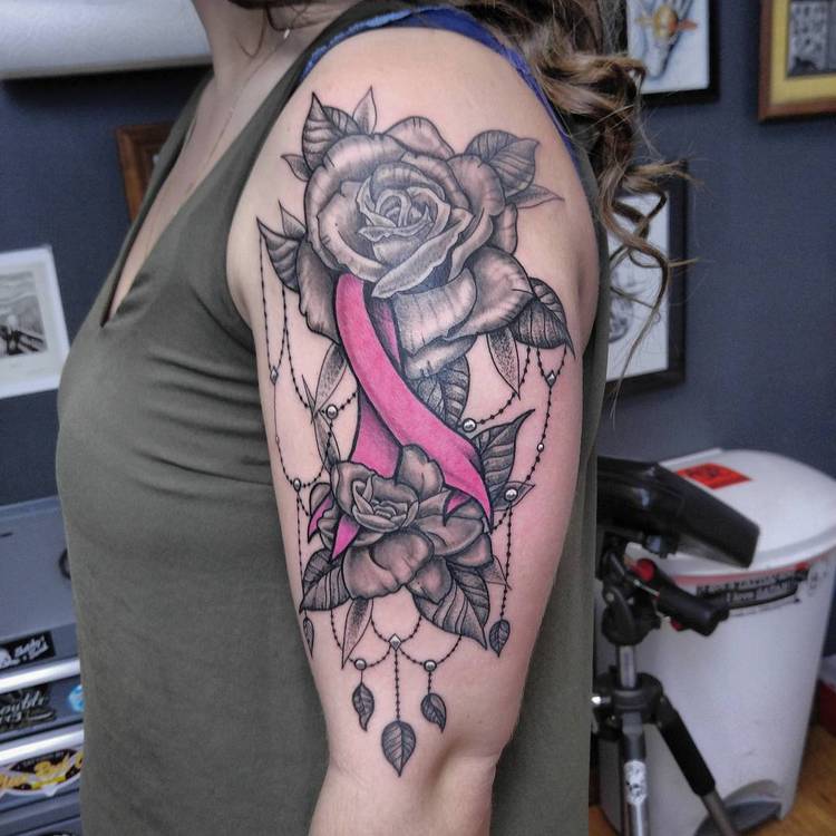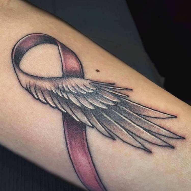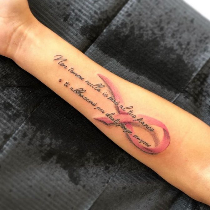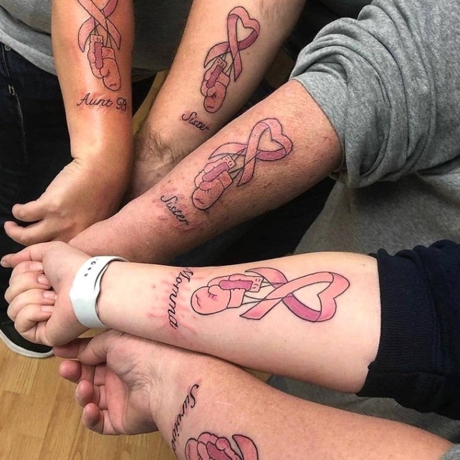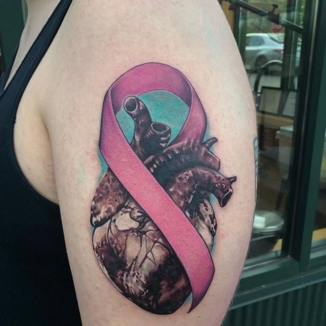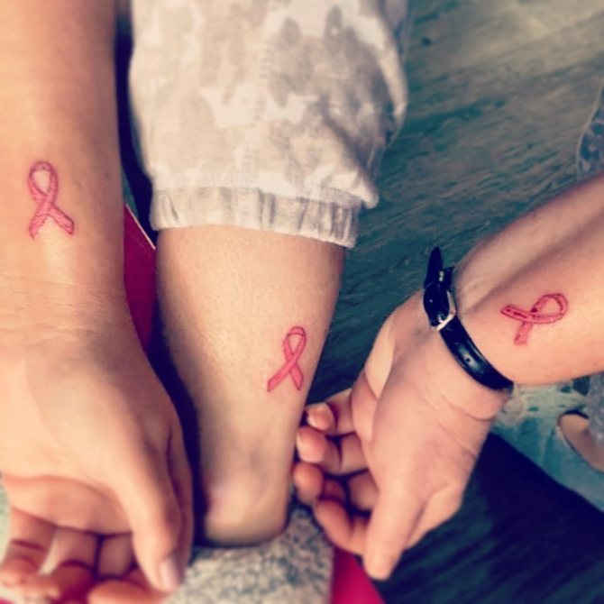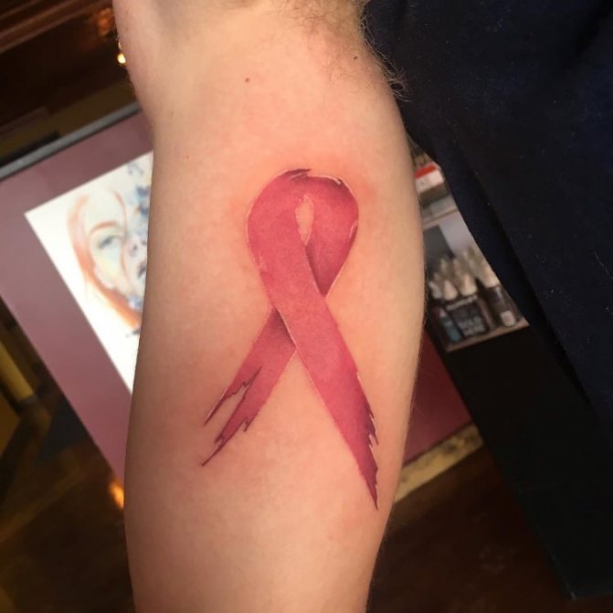 Det mest almindelige og enkle design består af en flettet lyserød sløjfe. Tatoveringen er normalt placeret øverst på armen (på skulderen) og betyder, at personen enten lider af brystkræft eller allerede har overvundet den. Mange mennesker, der lider af denne sygdom, beslutter sig for at få tatoveringer for at vise verden deres svære kamp og enorme livsvilje.