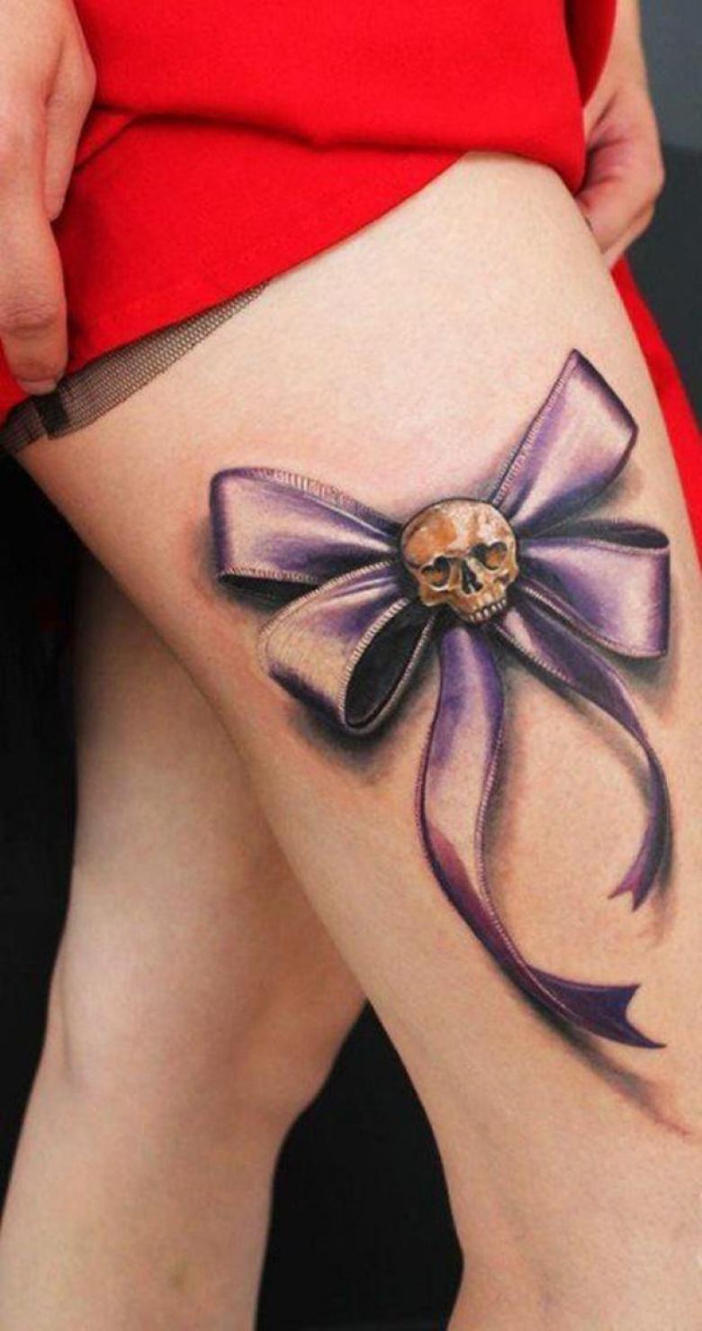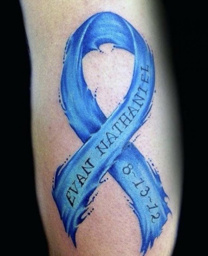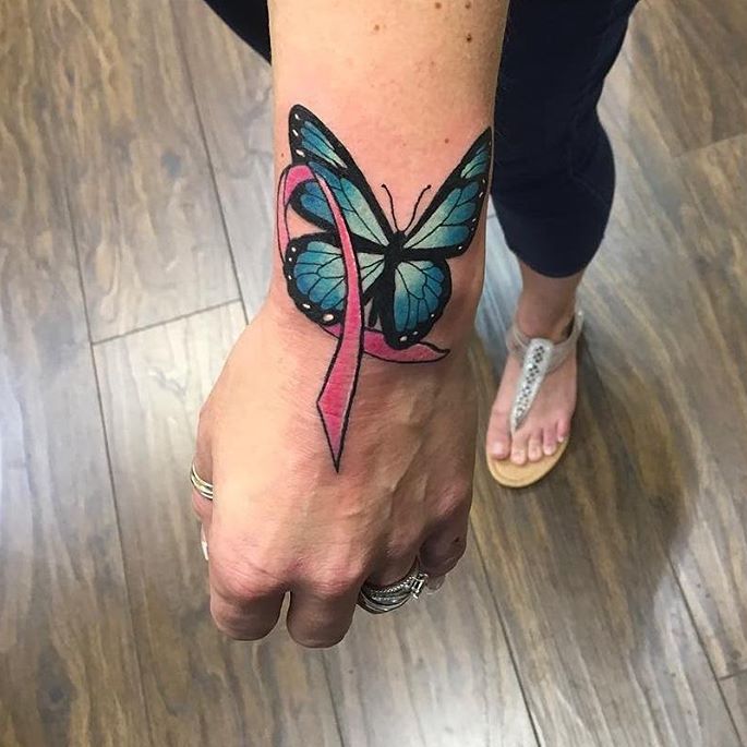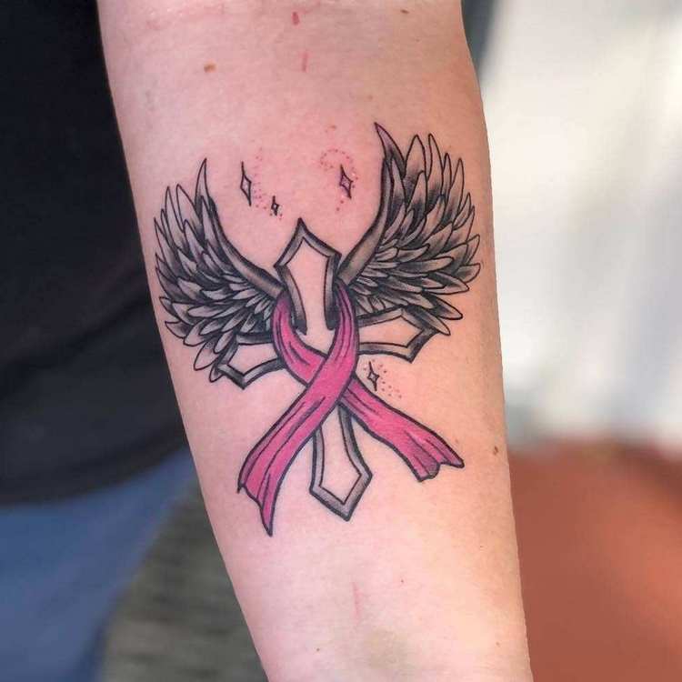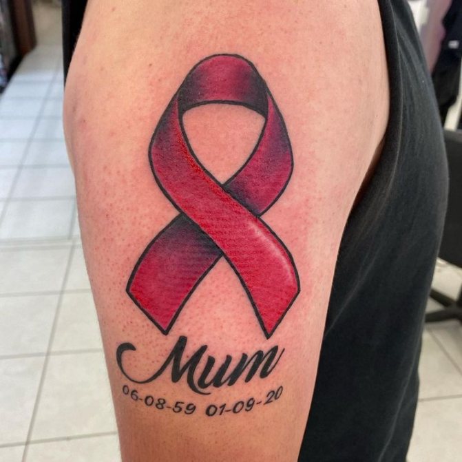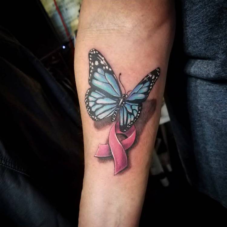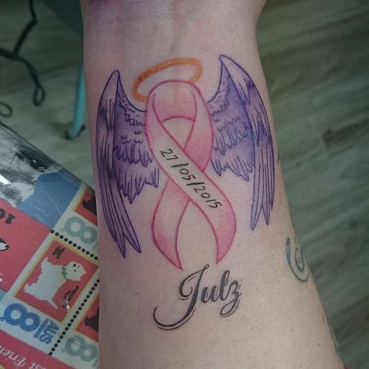 Det mest almindelige og enkle design består af en flettet lyserød sløjfe. Tatoveringen er normalt placeret øverst på armen (på skulderen) og betyder, at personen enten lider af brystkræft eller allerede har overvundet den. Mange mennesker, der lider af denne sygdom, beslutter sig for at få tatoveringer for at vise verden deres svære kamp og enorme livsvilje.