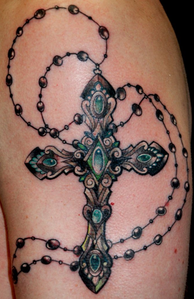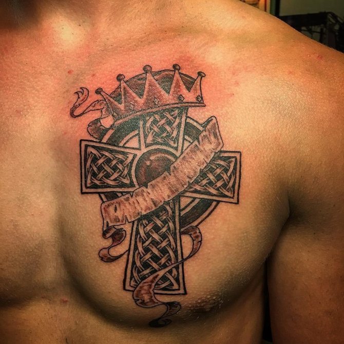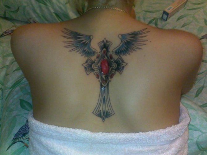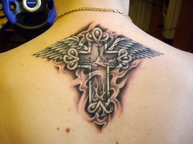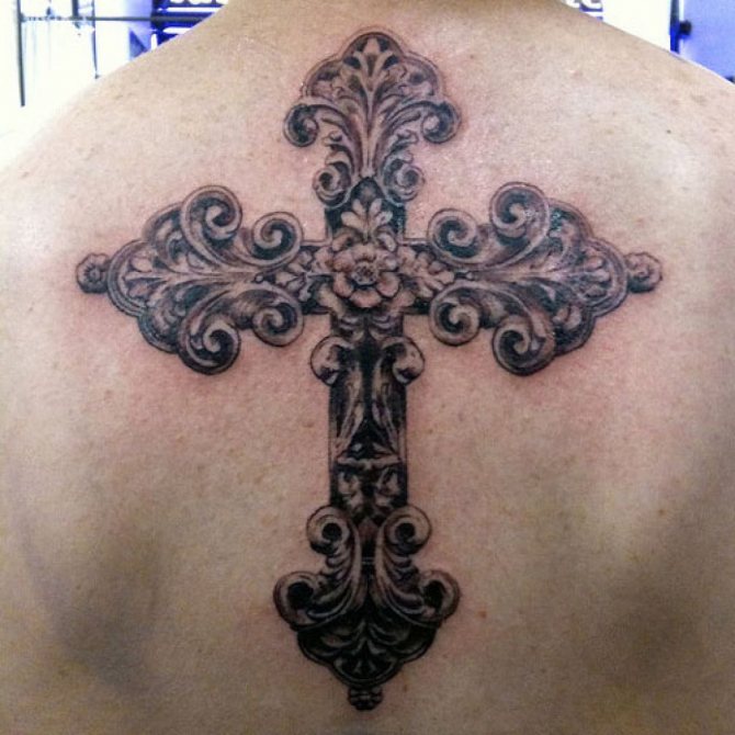 Korset er et centralt element i mange designs. Alle kan supplere den med yderligere detaljer - blomster, inskriptioner, torne osv., som gør tatoveringen mindre religiøs og mere verdslig.