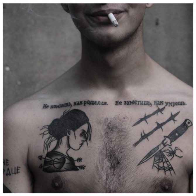 Fængsels tatoveringer, som er anført nedenfor, er designet til tyve i loven, lejrmyndighederne, cheferne. De har alle en bestemt semantisk betydning og svarer til den rang, som den person, der bærer dem, har. Hvis en almindelig mand laver en af disse, kan han få store problemer.