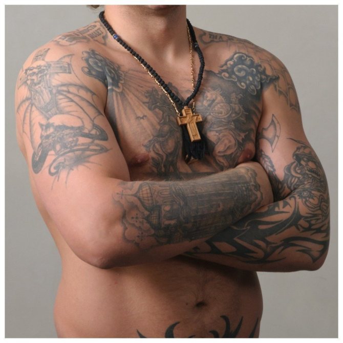 Når man ser på fængselstatoveringer og deres betydning, er det meget almindeligt, at fanger har religiøse tatoveringer. Hvad betyder de så? Guds Moder, der overvejende findes på ryggen eller brystet, kan være et tegn på en talisman mod alt ondt, eller at personen har været kriminel for tidligt, i en ung alder. En kirke på gerningsmandens krop er af stor betydning. For eksempel betyder antallet af kupler antallet af ture til fængslet eller antallet af år i fængslet. De kriminelle autoriteter tatoverede forskellige størrelser af krucifikser på deres kroppe, hvilket kendetegnede den indsatte i det højeste kriminelle hierarki, og det var en stor ære at få en sådan tatovering. Fanger kunne også få tatoveret klokker på sig. Det betød, at manden havde afsonet sin tid i fængslet i sin helhed, dvs. "fra klokke til klokke". De kunne også tegne munke, der skrev. Det betød en tyv-skriver, der kunne skrive et hvilket som helst brev uden problemer, eller en person, der var dygtig til at håndtere skarpe genstande som f.eks. en barberkniv eller en kniv.