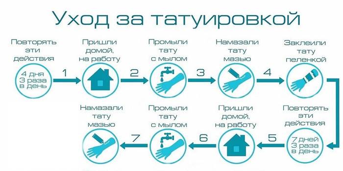 Nogle gange var tatoveringer dækket af vaseline og film - huden ville visne, pigmentet ville ikke komme ud, og den kunne heller ikke lide lugten. Denne skønhed kan forpeste og føre til ardannelse. Alle vejledninger indeholdt sætningen "Skrællerne må ikke pilles af!": de kom frem og faldt af sammen med pigmentet. Skorpe eller afskalning er et tegn på dårlig heling, og tatoveringen skal være fugtet og blød. Hvis håndværkeren anbefaler en fødevareindpakning, anbefaler vi, at du søger en mere professionel person, der holder sig ajour med tatoveringsinnovationer.