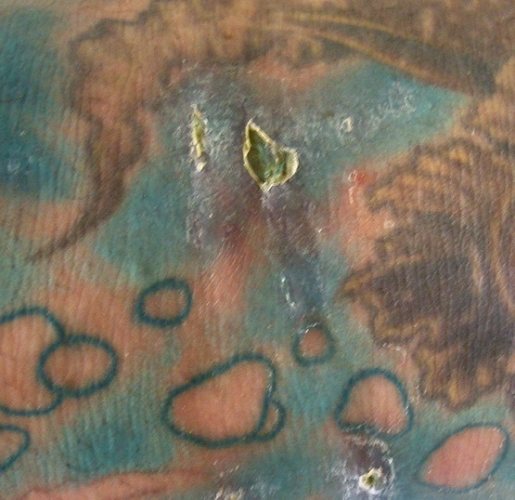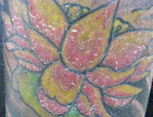 - misfarvning af tatoveringen, nogle steder helt tab af pigment;