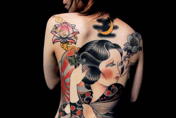 Oriental Oriental foreslår at udsmykke kroppen med lyse billeder af geishas, drager og berømte krigere suppleret med smukke detaljer af flora og fauna - sommerfugle, fugle, lotus, sakura. Hovedbilledet er sammensat af uforenelige elementer, hvilket gør det unikt. Der anvendes guld, rødt, sort, grønt og andre farver.