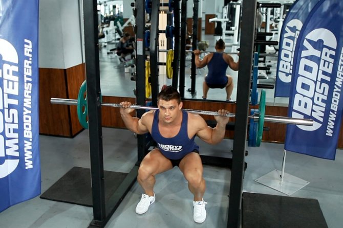Ändern Sie dabei immer die Position Ihrer Füße. Drücken Sie sich mit den Füßen ab und verschränken Sie niemals die Arme über der Brust, um Ihre Beine zu unterstützen. Wenn Sie die Übung mit dem gewählten Gewicht nicht korrekt ausführen können, ist es besser, Ihren Stolz zu dämpfen, indem Sie ein kleineres Gewicht nehmen. Und wenn Sie Ihre Technik beherrschen, können Sie mit allen, auch mit großen Gewichten arbeiten.