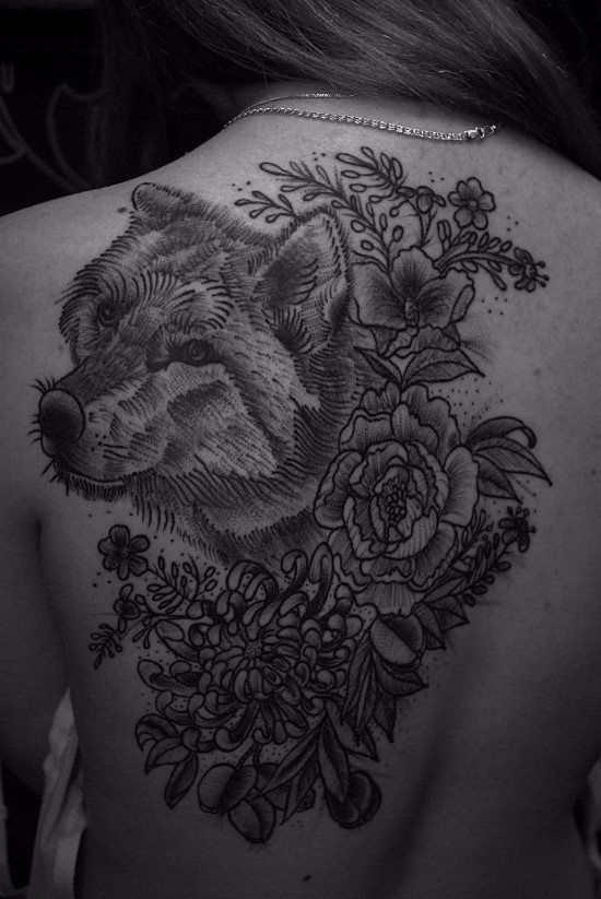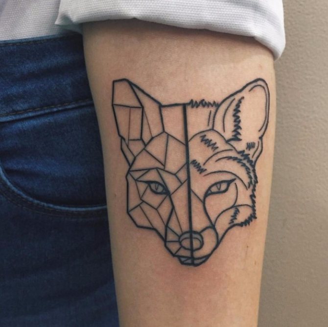Ein Linerwerk-Tattoo mit einem Fuchs ist ein häufiges Motiv, das von Mädchen bevorzugt wird. Die Anwendung unterstreicht die Kultiviertheit, die Verspieltheit, das Savoir-faire und den Ehrgeiz eines Mädchens. Dieser Stil kann mit einem Hintergrund im Dotwork-Stil verwässert werden, und der Fuchs selbst kann übermalt werden.