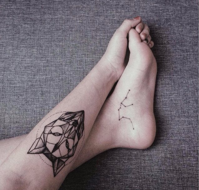 Der Löwe ist auch bei Mädchen sehr beliebt, der Fuchs. Meistens wird sie in Bewegung dargestellt. Der Körper des Tieres kann zur Hälfte aus geometrischen Formen bestehen, die andere Hälfte stellt die Anatomie des Tieres realistisch dar.