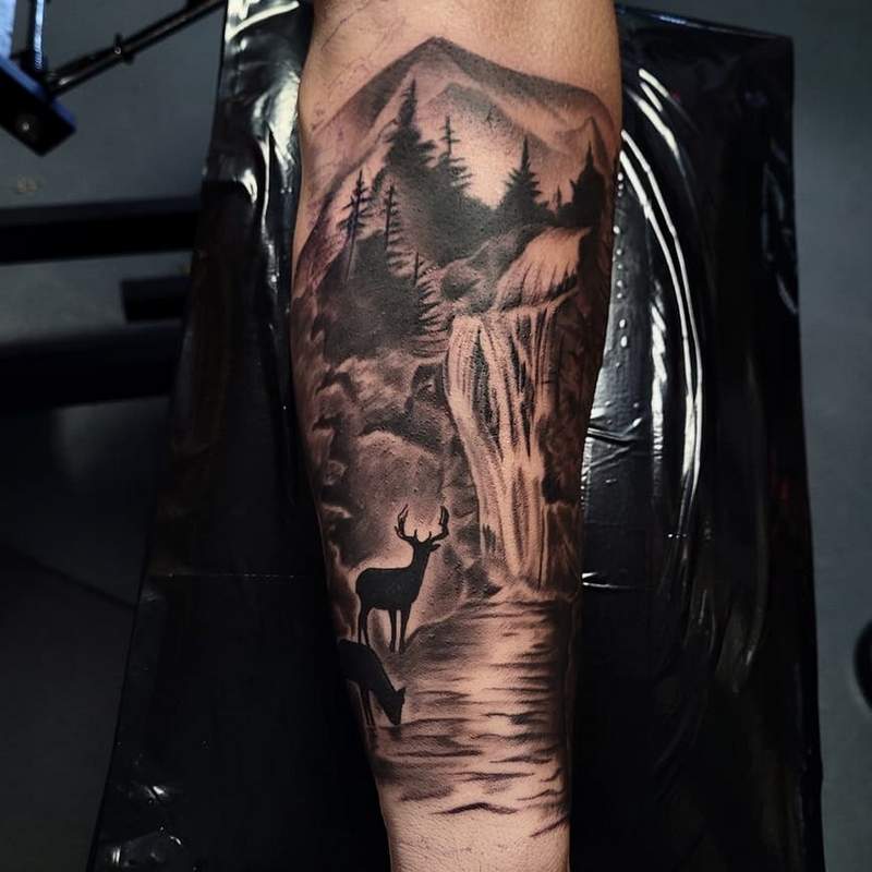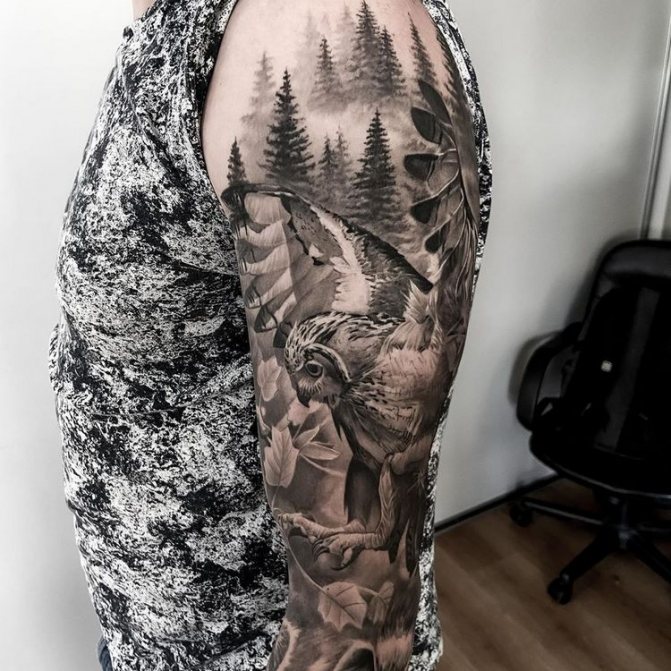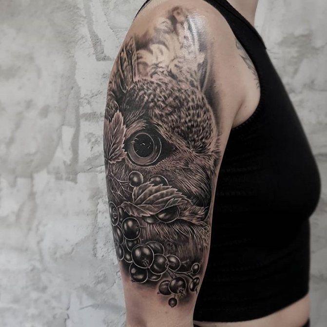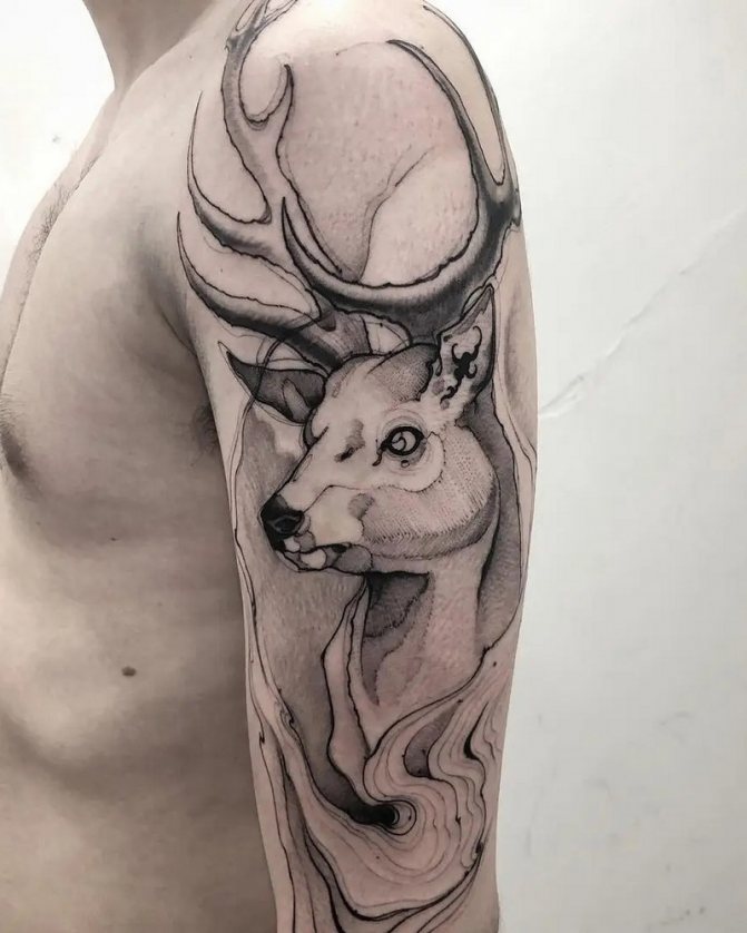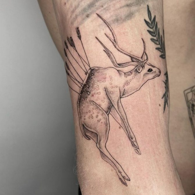Wie viele bedeutende Tiere haben auch Hirsche die begehrtesten Kombinationen mit anderen Motiven, die dem gesamten Tattoo eine besondere individuelle Bedeutung verleihen. Mädchen kombinieren mit Blumen, Männer mit Pfeilen. Während im ersten Fall die Zeichnung friedlich ist, stellt sie im anderen Fall den offensichtlichen Instinkt eines Jägers dar.