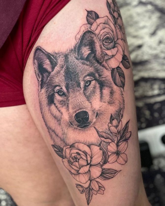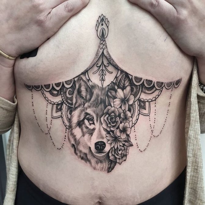 Der Wolf kann auf der Körperskizze auf unterschiedliche Weise aussehen. Es hängt alles von der Person ab, die einen Wolf auf den Körper zeichnen möchte: